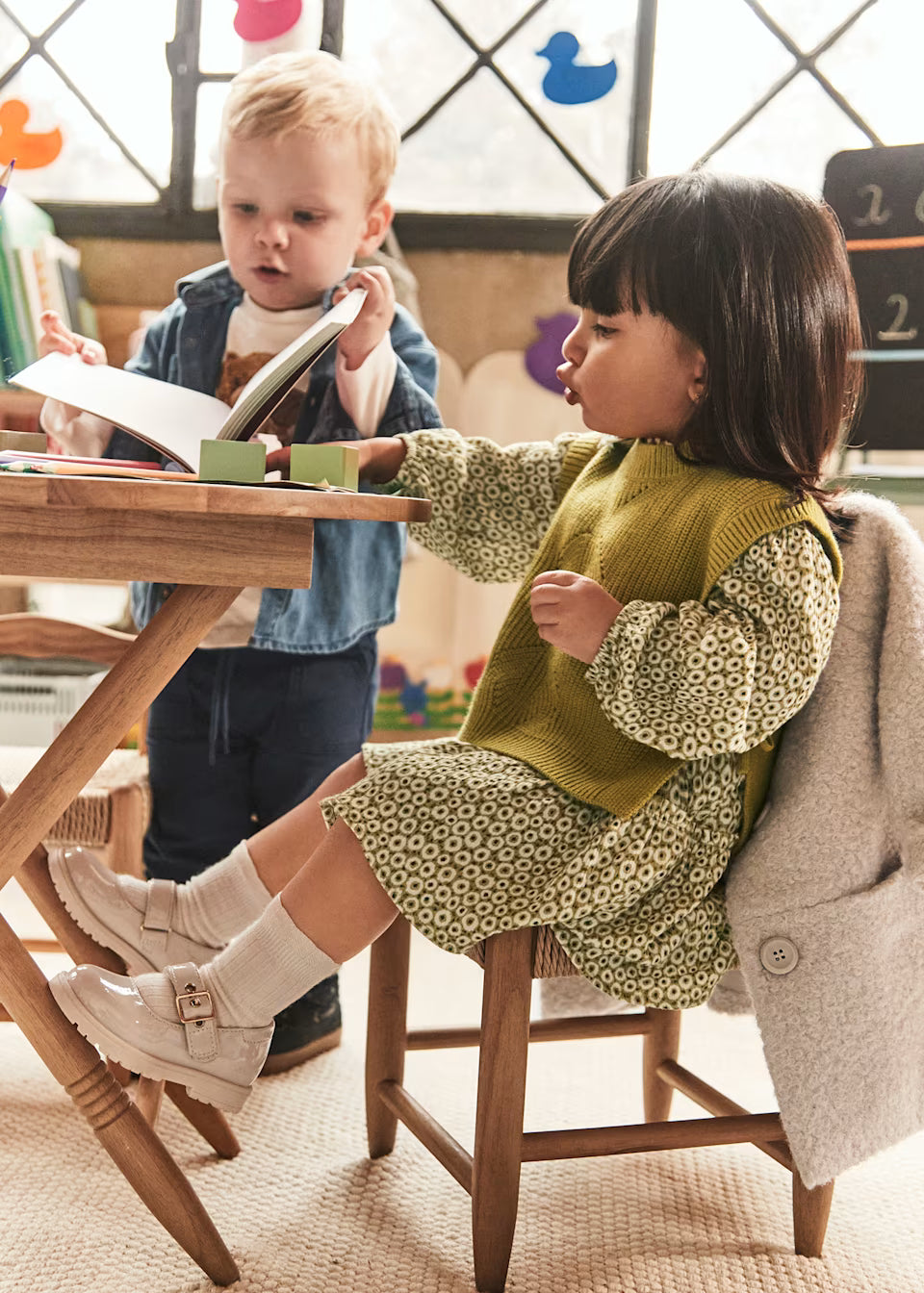 Descubre este adorable conjunto de dos piezas en color oliva, perfecto para cualquier ocasión. Incluye un chaleco de punto tricotosa y un vestido de manga larga estampado, diseñados con tejidos suaves y cómodos para acompañar a tu pequeño en su día a día.